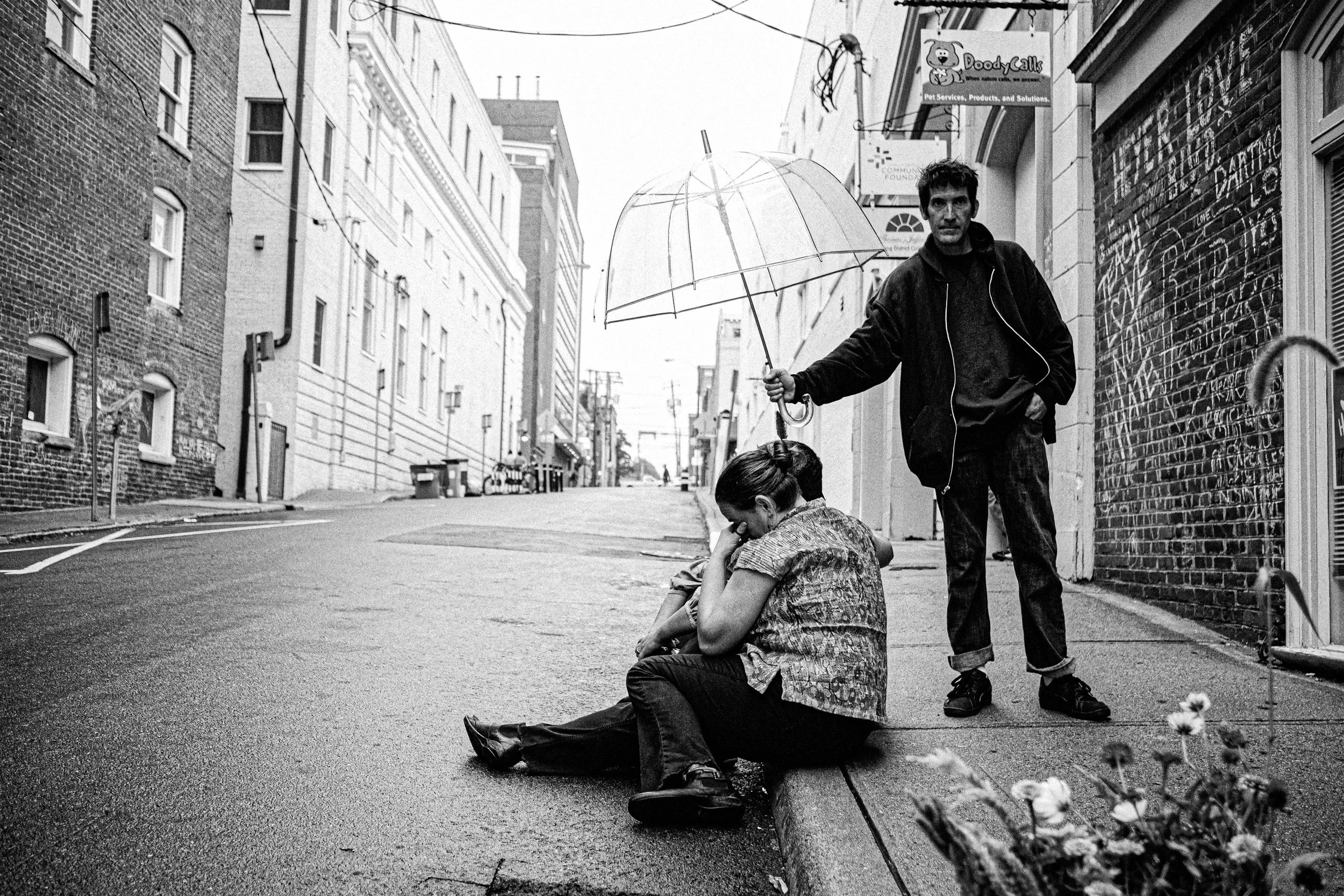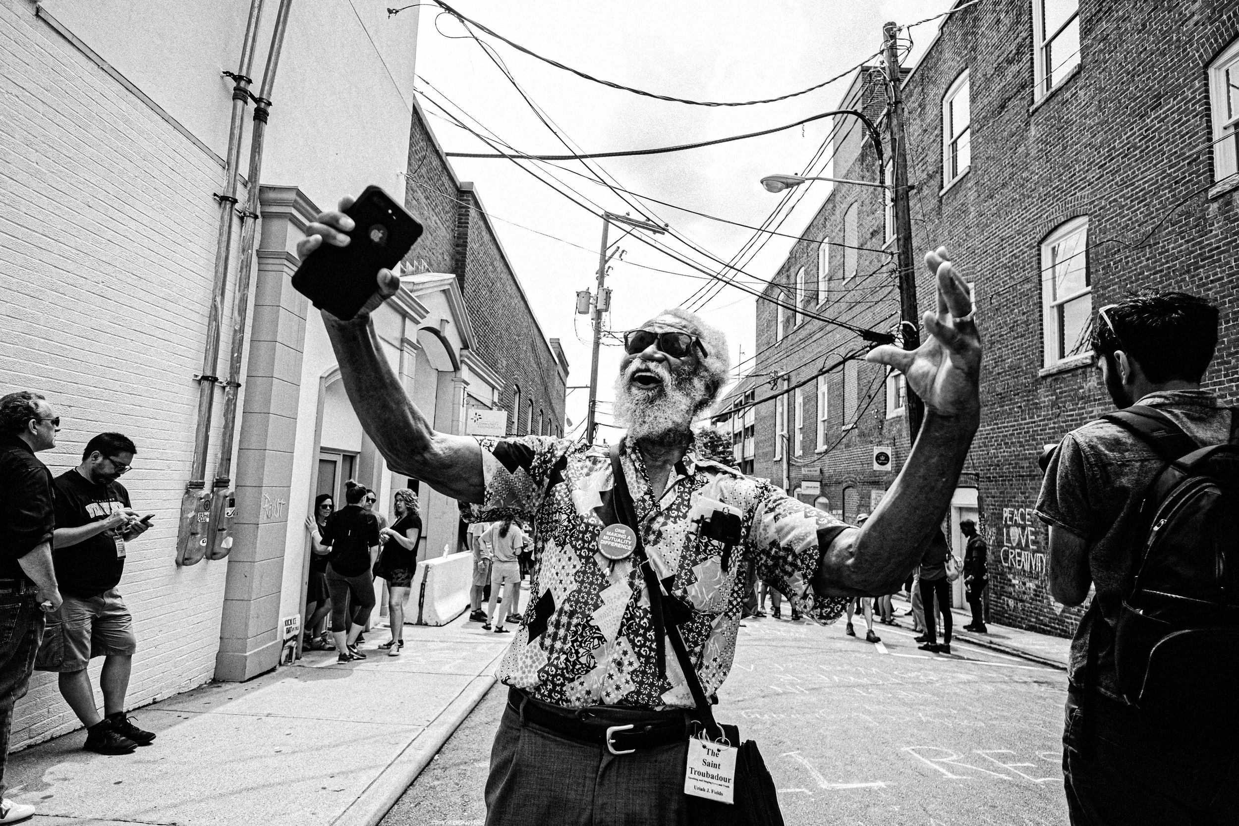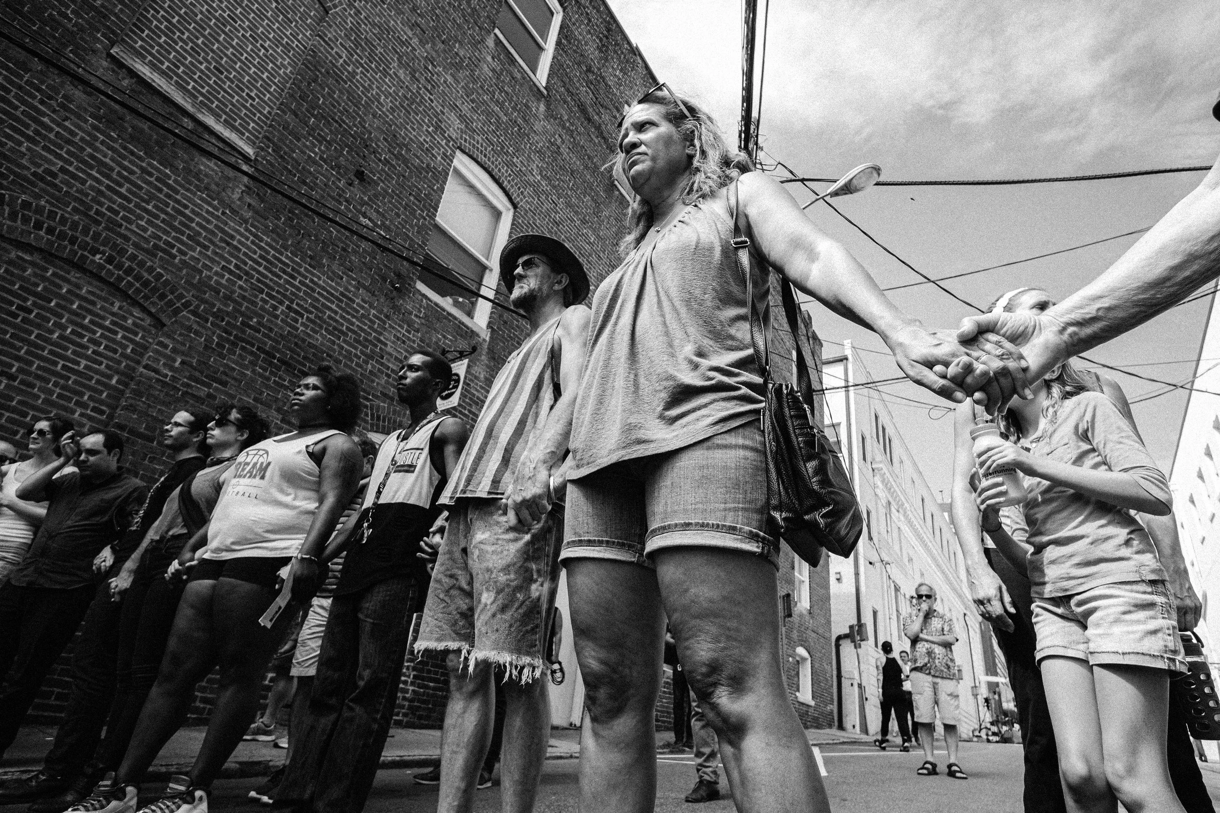 Large photographs of our community coming together in resistance – holding space, being brave, being vulnerable, showing love for each other – are suspended among the trees of the downtown mall. With the aid of a QR code scanned by a smartphone, viewers are transported to the exact moment of the photo as they hear the voice of the person featured describing the experience in their own words. This project elevates our stories, pushing beyond the media’s narrative of Charlottesville and creates opportunities for healing through storytelling.